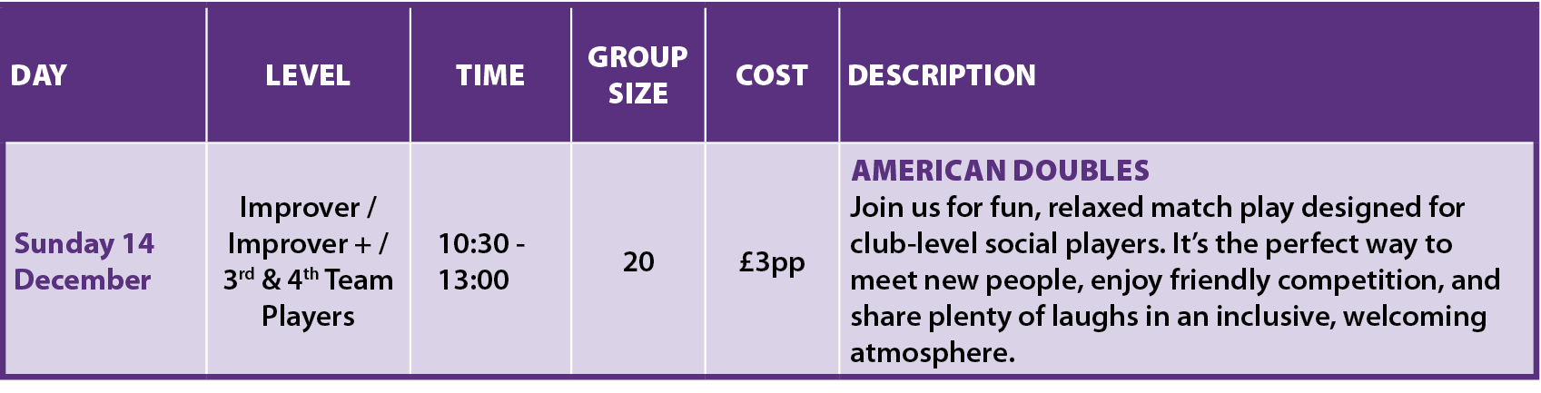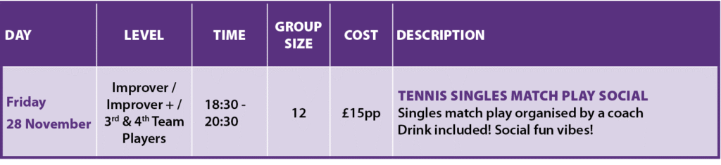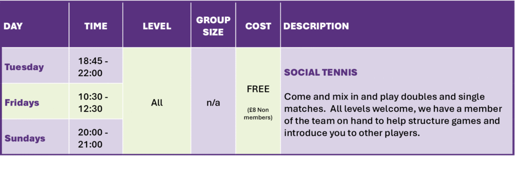 Whether you are a complete beginner, rusty racket or a someone with playing experience wanting to fine tune your game, our adult programme offers something for everyone!