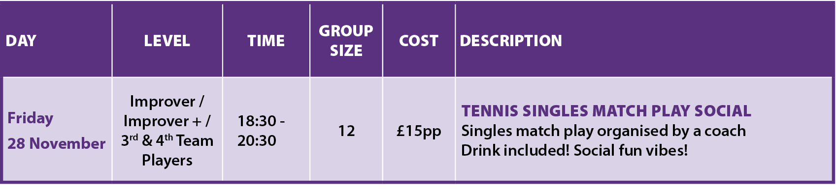 - No previous Tennis or racket sport experience, have just started to play or a “rusty racket” returning to Tennis