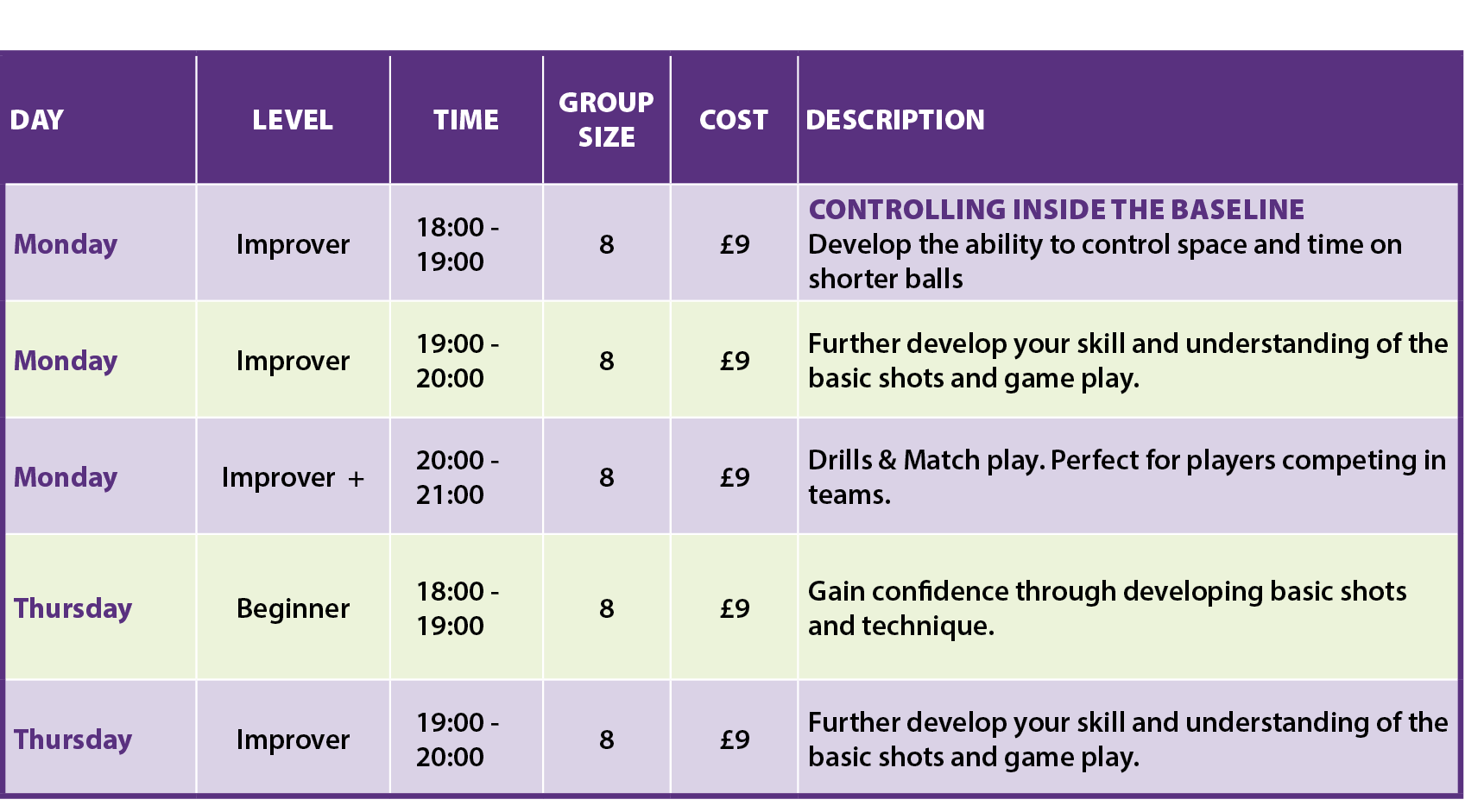 Alternatively, private lessons can be arranged for a small group of players of a similar standard. This is available for both juniors and adults.